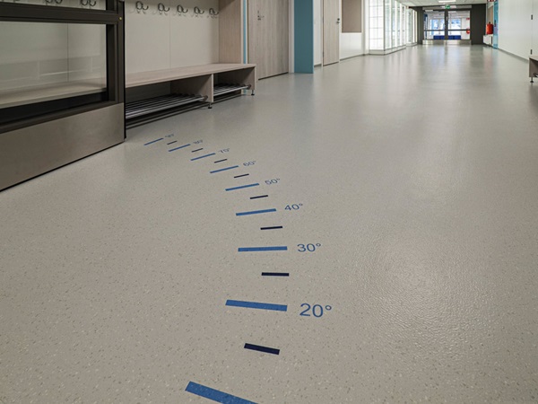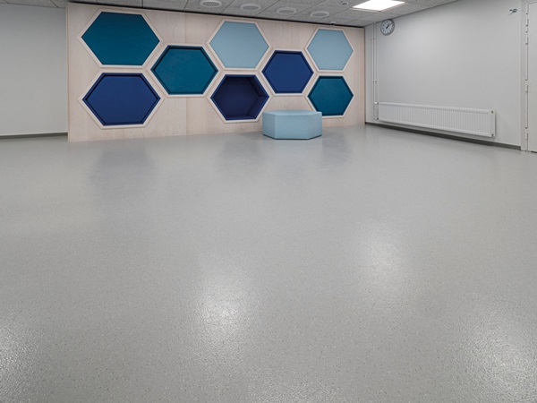 Meritori Primary School has a mathematics and science focus, which needed to be reflected in the interior design. “With the rubber floors, we had the opportunity to create geometric inlays that precisely matched the interior design plans and reflected the spirit of the school,” Uitto explained. Whether complex logos, fonts or characters, the intricate rubber inlays are produced in the factory’s own inlay centre on state-of-the-art cutting machines. Everything is made to order with millimetre precision. An individual installation plan is supplied so that the installation can be carried out quickly and easily.
