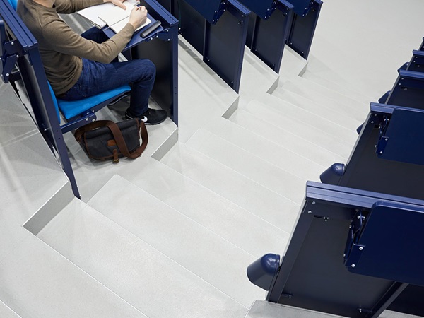 Zu den akustischen Maßnahmen bei der Raumplanung gehört die Reduzierung des Lärms am Ort des Entstehens. Das bedeutet auch, die Gehgeräusche so gering wie möglich zu halten, um störenden Lärm zu vermindern, etwa, wenn Personen zu spät kommen oder bereits während der Vorlesung den Hörsaal verlassen. Hier zeigt sich, dass die dauerelastischen nora® Bodenbeläge aus Kautschuk die Gehgeräusche besser reduzieren als dies bei einem Hartbelag möglich ist. Damit tragen nora® Bodenbeläge zu einer ruhigen und konzentrationsfördernden Lernatmosphäre in Hörsaal, Aula und Bibliothek bei.