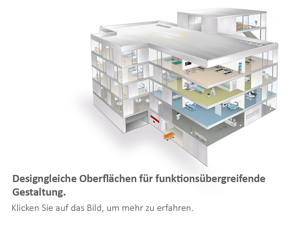 Mit designgleichen Oberflächen werden funktionsübergreifende Gestaltungskonzepte möglich für das Krankenhaus mit seinen besonderen Herausforderungen.