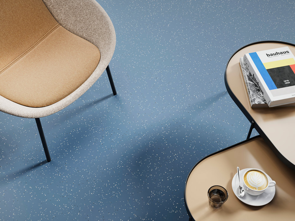 Kautschukbelag mit einem changierenden Grundton aus drei harmonisch aufeinander abgestimmten Farbkomponenten und charakteristischen Granulateinschlüssen. Erhältlich mit glatter oder reflexbrechender Oberfläche.