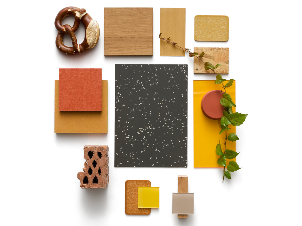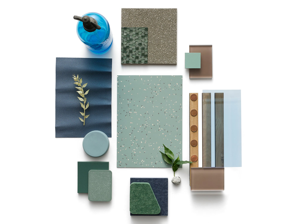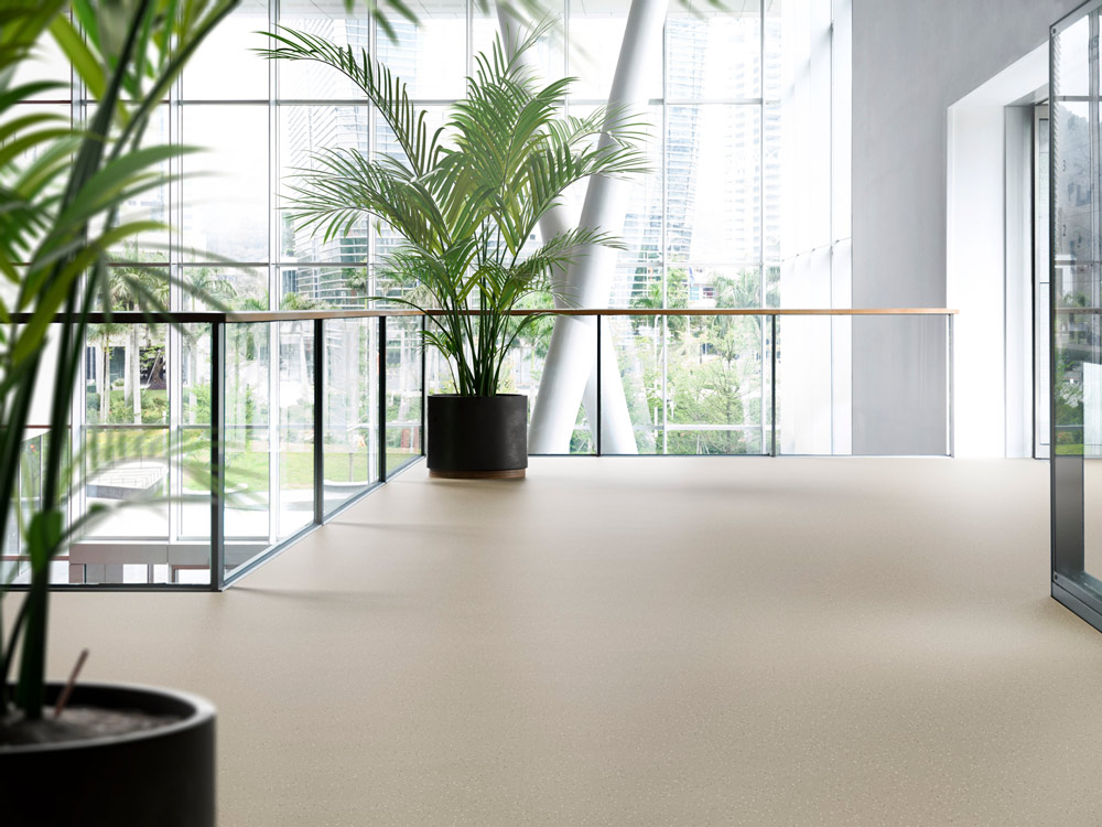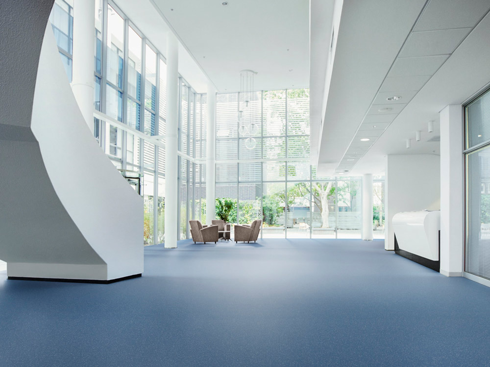 Revêtement de sol caoutchouc avec coloris de base changeant à trois composants chromatiques harmonieusement assortis et incrustations de granulés caractéristiques. Disponible avec surface lisse ou surface structurée discrète.