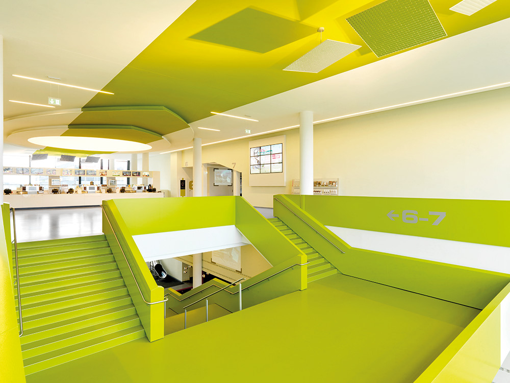 Rubber flooring for extremely heavy traffic areas with tone-in-tone granular design and classic hammerblow surface or elegant, slightly textured two-tone surface.