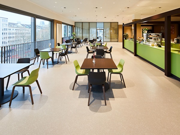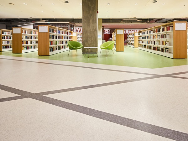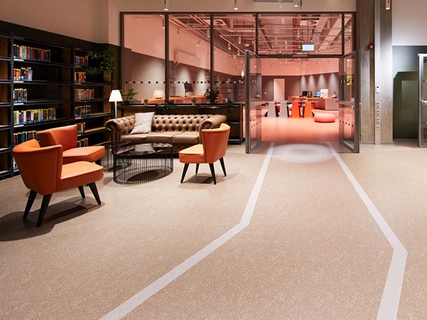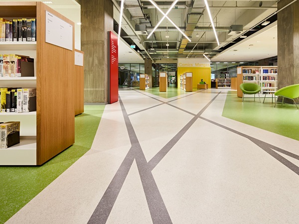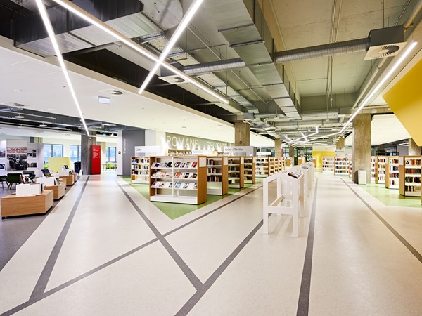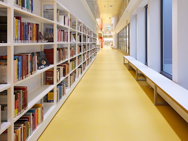 When renovating the central library, using environmentally friendly and healthymaterials was of vital importance for the planners, builders and users. noraplan® rubber floor coverings, winners of the Blue Angel awards, contain no phthalate plasticisers and are extremely low in emissions, ideal conditions for excellent indoor air quality. Furthermore, all nora® floor coverings, in line with the Carbon Neutral Floors™ programme, are CO2 -neutral over their entire lifecycle. “The environmental aspect is required and taken into account by more and more municipal procurement projects”, says Martina Hoock, nora market segment specialist for education. “We calculate our products’ carbon footprints over their entire life cycle from procurement of raw materials to production, service life and disposal. In this regard, we far surpass the conventions of other manufacturers who may advertise CO2neutrality but often limit their information on CO2 emissions to individual phases.” nora has a threefold approach to reducing the products’ CO2footprint, exactly as stipulated by the Federal Environment Agency: Our first priority is to prevent emissions in the first place. If this is not possible, we reduce the emissions produced. Lastly we offset any remaining emissions by means of emission reduction certificates