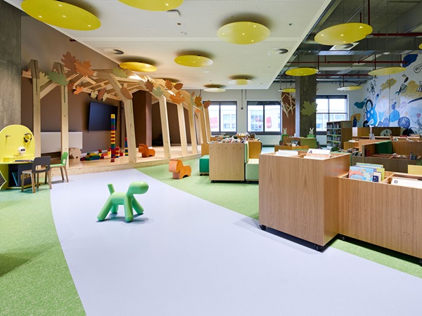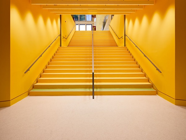 Every department has its individual colour scheme: noraplan® lona in a friendly green and earthy shades was installed in the adult reading areas, the youth library was fitted with brown flooring, the LibraryLab floor is red and the children’s library was given green floor coverings. The grand staircase is an absolute show-stopper. At almost five metres wide, it leads from the spacious foyer to the third floor and is fitted with rubber floor coverings in a bright and sunny yellow. The area around the atrium and the Real Labor on the third floor were also fitted with yellow flooring. In the children’s library a blue inlaid river snakes through a green meadow. This was achieved using innovative technology at the inlay centre of the Weinheim rubber specialists, where they use ultrasonic cutting systems to produce motifs, logos and lettering of all kinds with the highest precision. The endless inlay design options and dimensional stability of the rubber material mean the coverings can be installed without joints and give you almost limitless freedom of design – and not just for floors. For example, the rubber floor coverings have been used as colourful stylistic elements on the tiered seating and stage located on the third floor and in the LibraryLab.