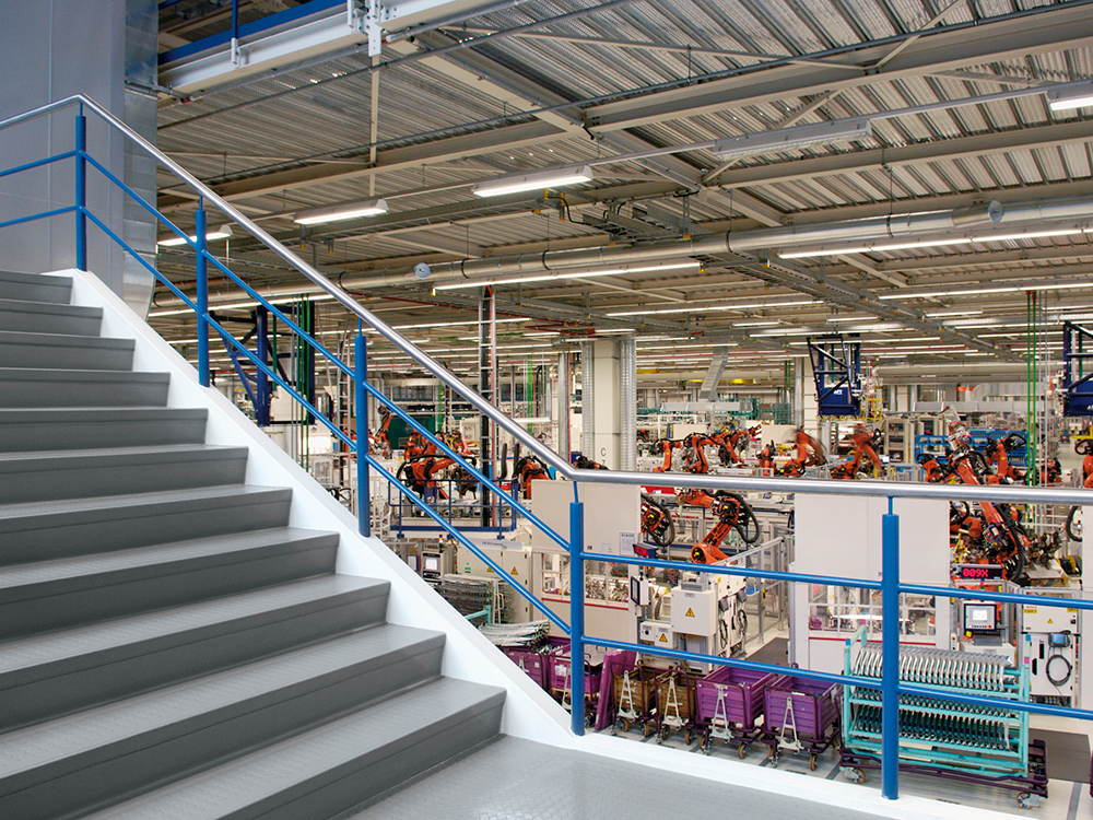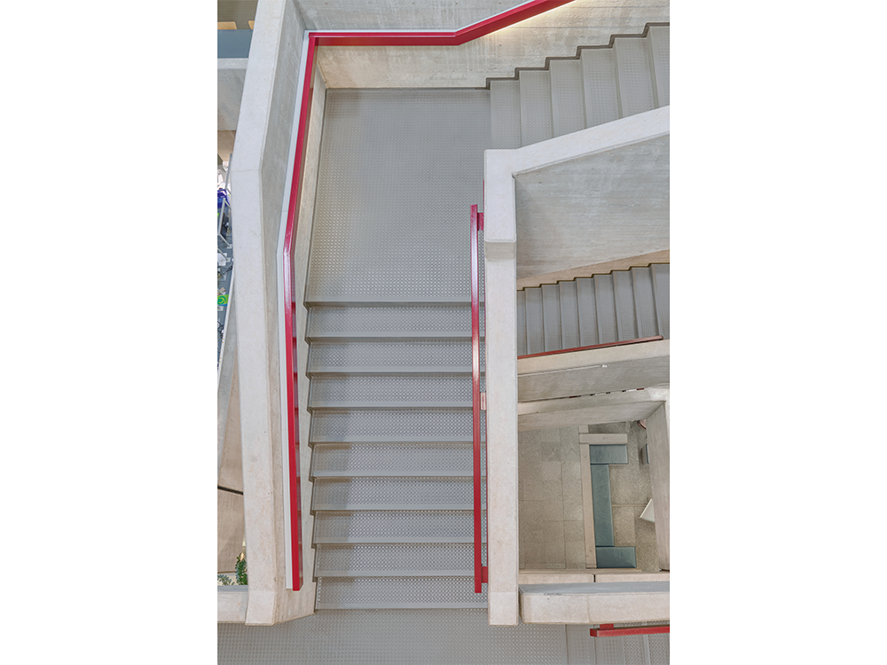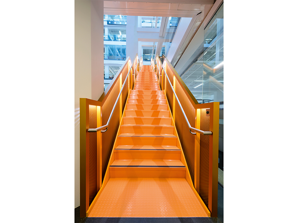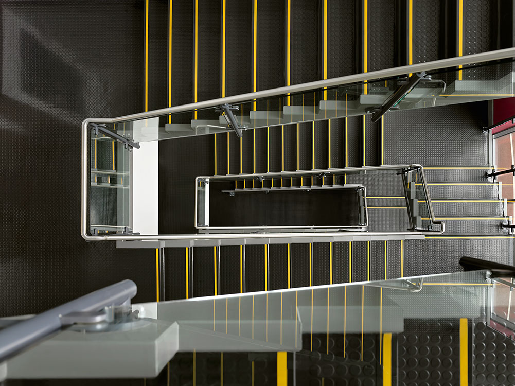 Stairtread with flat, direction-oriented relief structure with fine grain design and modern marbling, footfall sound absorption improvement of 12 dB. No two stairtreads are the same – each stairtread is totally unique.