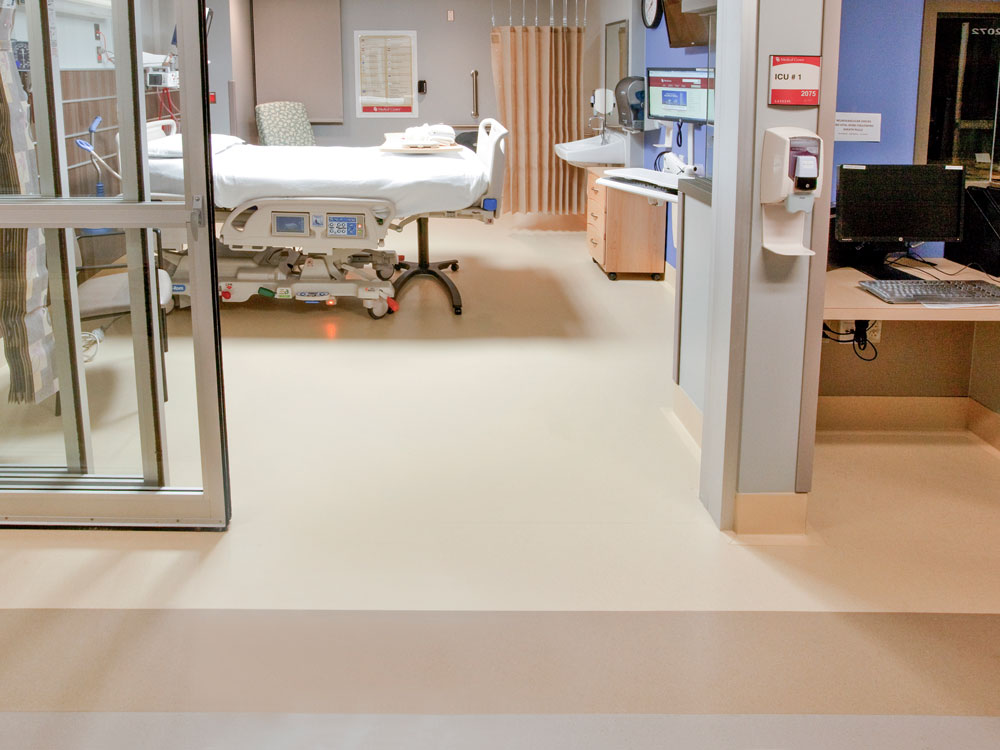 Support the challenging clinical demands of a 24/7 Intensive Care Unit (ICU) and a Catheterization Lab with durable flooring that cleans easily, provides enhanced sound attenuation and installs quickly and effectively.