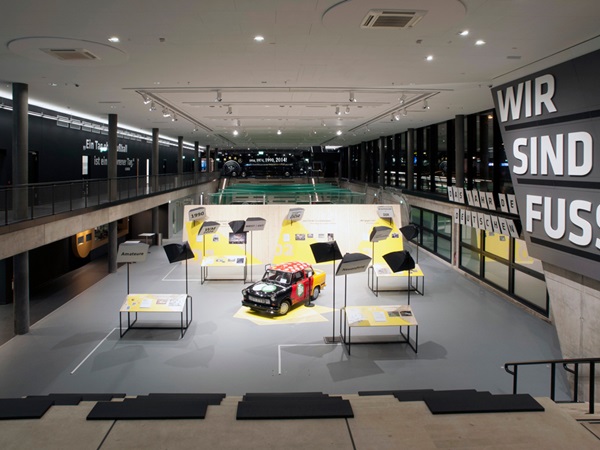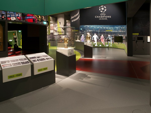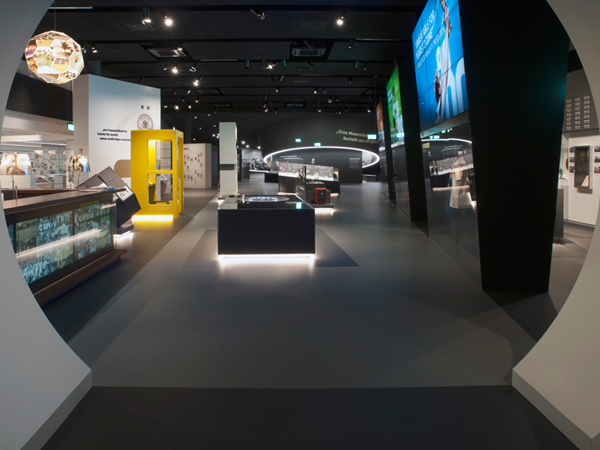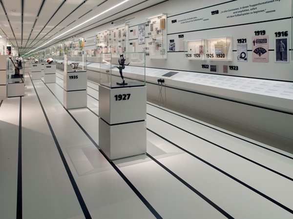 The dramaturgy behind the exhibition follows the course of a football match: In the five theme worlds “Before the match” (introduction to the emotional mood), “First half” (the world of national teams and German football), “Half time” (coaches and tactics), “Second half” (the world of club football), and “After the match” (playing area), visitors experience the many facets of the football world as presented by technically innovative, but also classical media. The emotional climax of the exhibition is the treasure room with the cups won by the national team and the federal league clubs as well as the Hall of Fame for the major German players and the team bus for the 2014 World Cup.